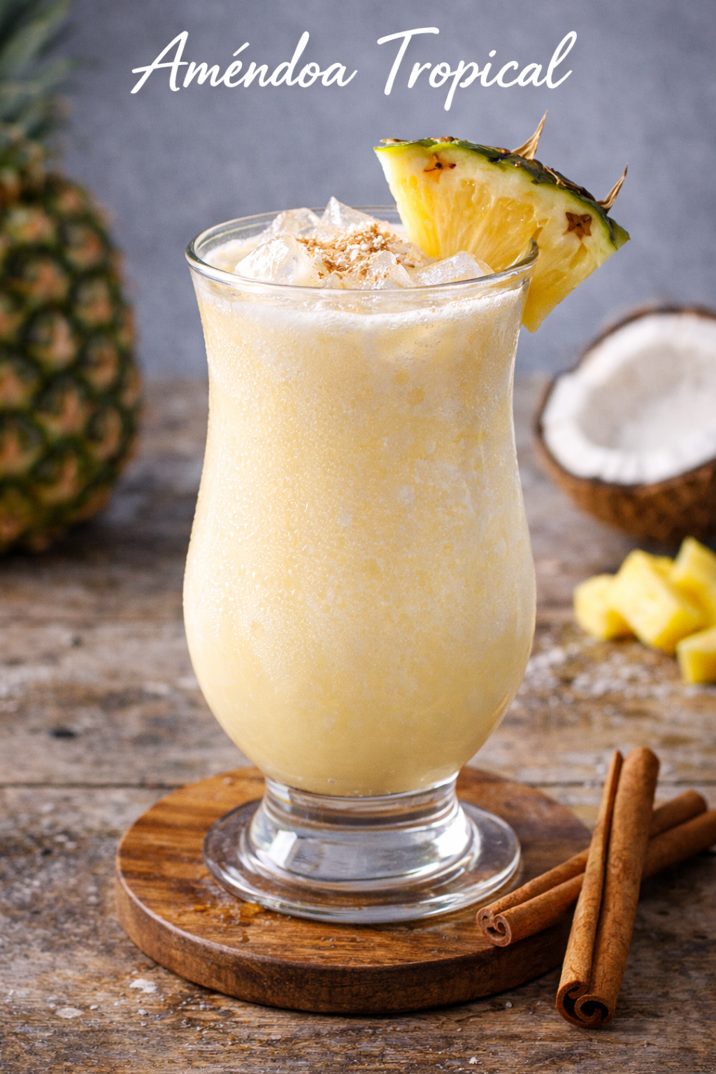 No liquidificador: 200 ml de suco de abacaxi, 100 ml de leite de coco, 1 colher (sopa) de Licor Vitale Sabor Amarula e gelo.